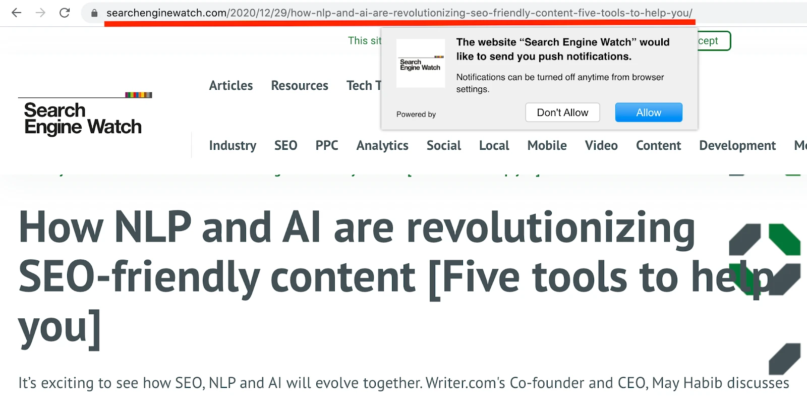 For example, Search Engine Watch includes a date in the URL structure and the full headline of an article. The URL structure is not optimized for SEO.