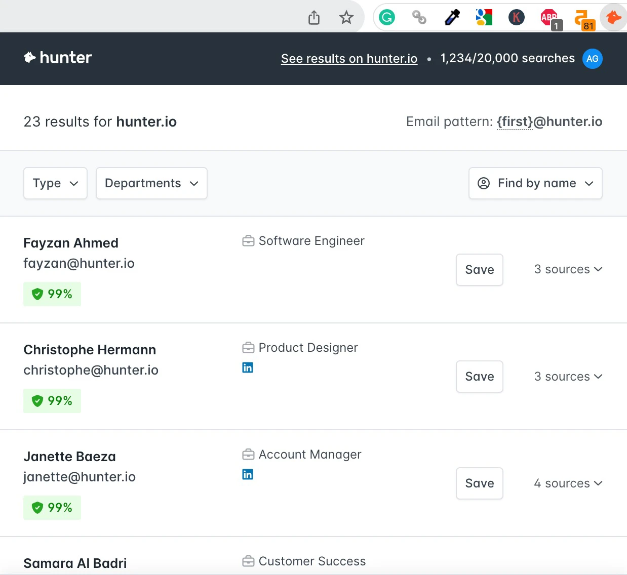 Hunter Chrome extension speeds up the whole cold email process. It lets you find valid email addresses of the website you are currently browsing. You can later sort the results by type and department, making your prospecting more targeted. A verification score determines the confidence of each email address. The higher the score, the higher the chance your emails will get delivered to a recipient’s inbox.