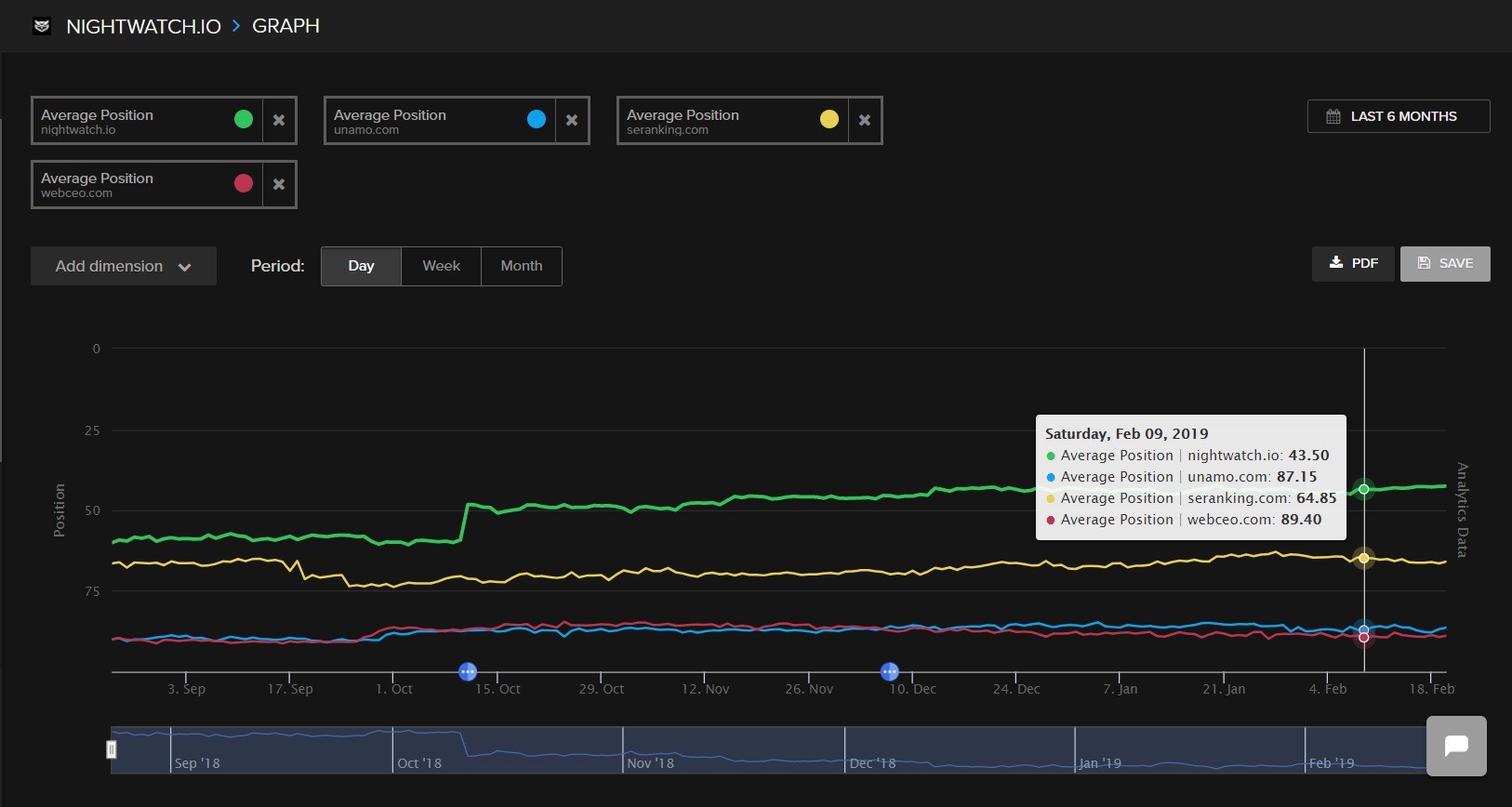 Make sure you research all the keywords that you and your competitors are ranking for to get a more precise idea of who is leading on the market. You can discover keywords and competitors in Nightwatch or do manual keyword research with Google Keyword Planner.