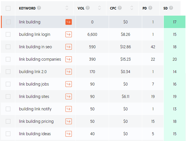 To do this, you can take a parent keyword like “link building” and insert it in your main SEO software to get different longtail variations until you’ve got a list of relevant key phrases.