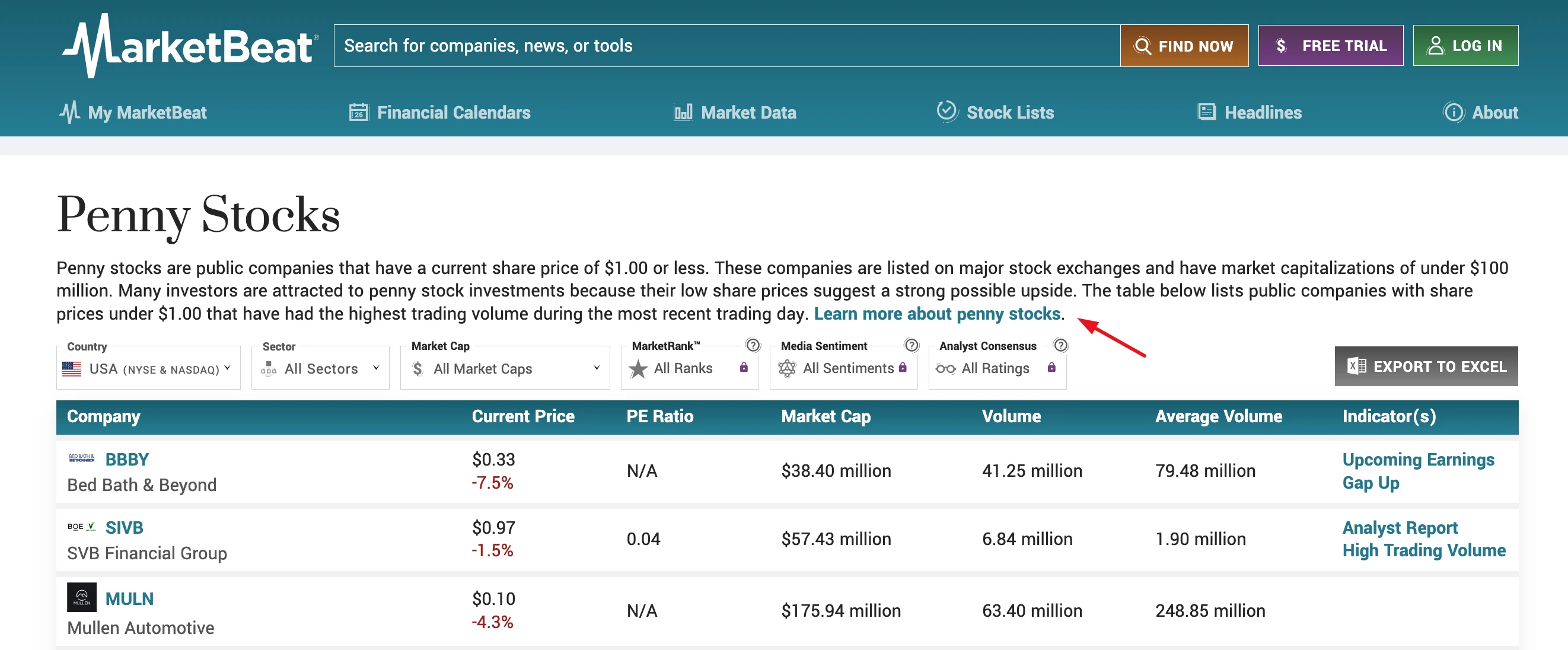 Take a look at this MarketBeat list of penny stocks. It links out to several other pages that provide information on penny stocks, both from a section on penny stock headlines and other informational guides from the content itself.