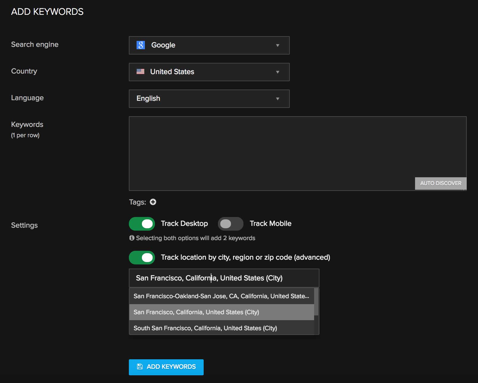 Important note: Make sure you always configure the exact location when tracking a keyword that does not include the location name - for example, sushi. If you don’t do that, Google will determine the location by itself, which may not be the same as the area you want to track. Therefore the results won’t be accurate.