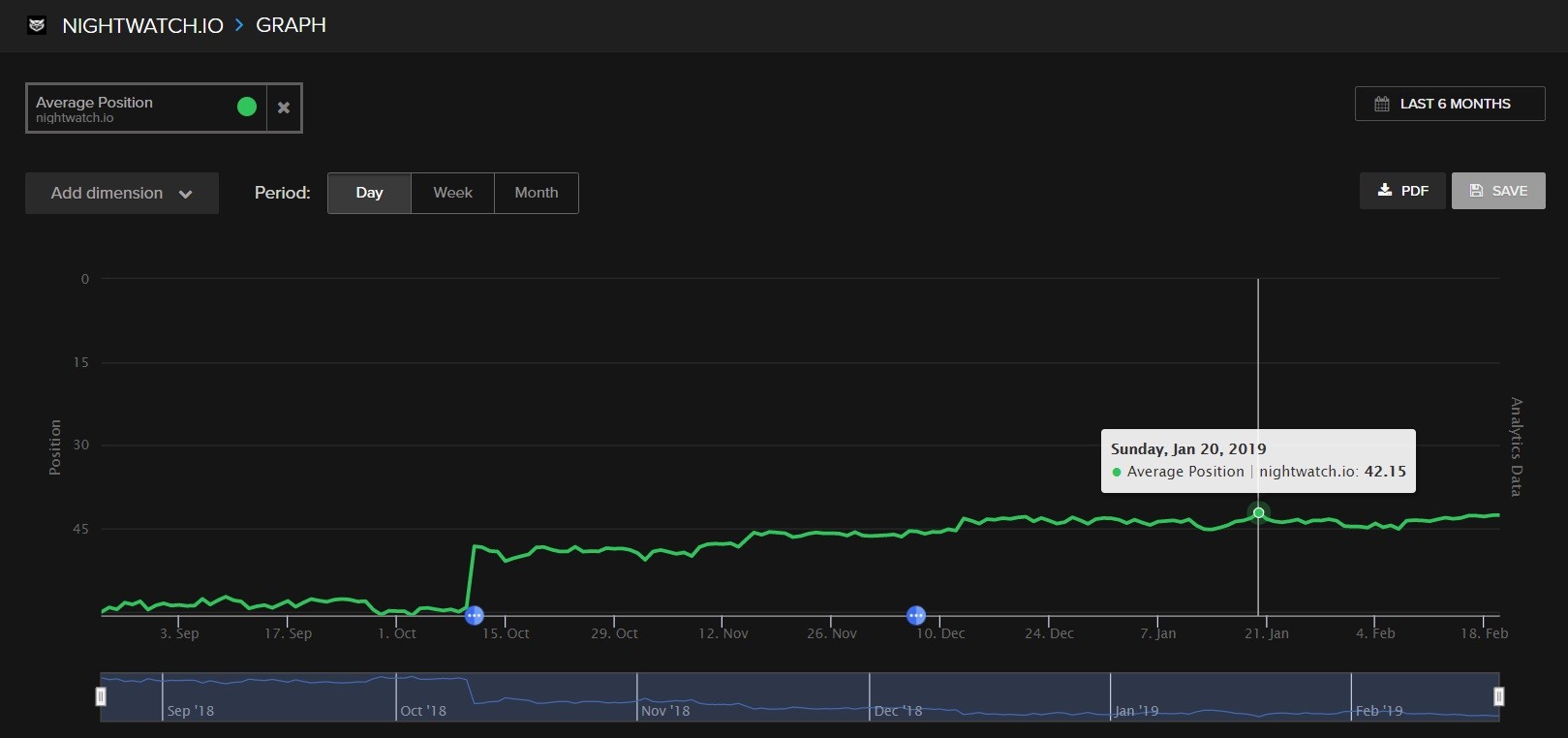 How to: On your Nightwatch graph, select “Average rank” under Website. Another dimension you can put on the same graph is the total number of tracked keywords because the average rank is likely going to change when you add or remove tracked keywords.